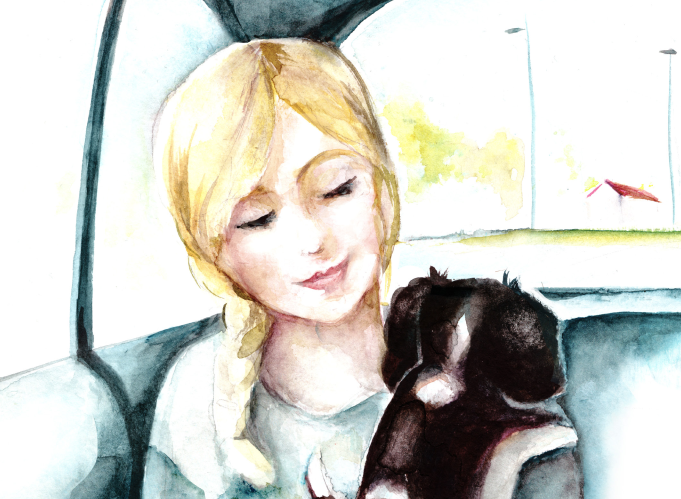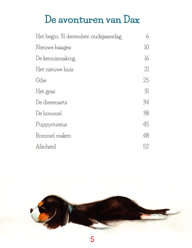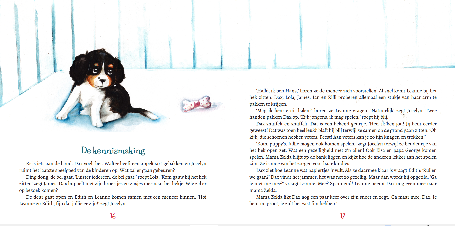 Dag Dax! Veel plezier!' roepen zijn broertjes en zusjes. Nog een lik van papa George en daar gaan ze dan. Ze stappen de auto in. Hans gaat achter het stuur zitten en Edith zit naast hem. Dax mag op de achterbank bij Leanne op schoot. Ze rijden de straat uit.'Maar, wacht eens even... Mama Zelda, Papa George en mijn broertjes en zusjes zijn er niet! Ik wil terug!' schrikt Dax en hij begint te huilen.